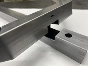 木材で言う「相欠き」のように、角パイプを互いに欠き取ってはめ込むような形状になるよう加工しています。単純にパイプを十字に組み合わせるとなると、3本のパイプを溶接する必要がありますが、先述した加工形状にすることで、パイプを2本しか使う必要がなくなり、部品数を減らすことができます。また、組付け時に前後左右にズレにくく、位置決めが簡単です。